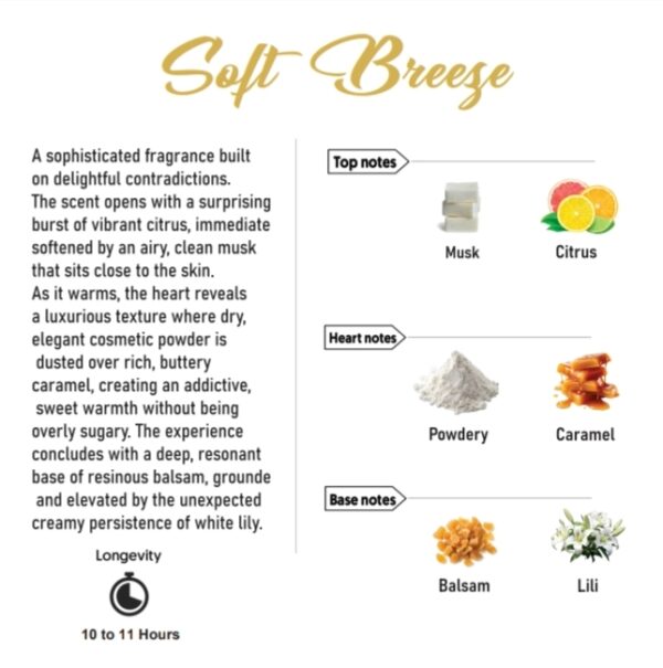 Soft Breeze is a perfume that feels fresh, warm, elegant, and intimate — all at once.